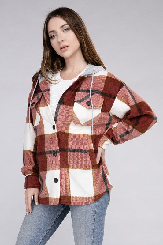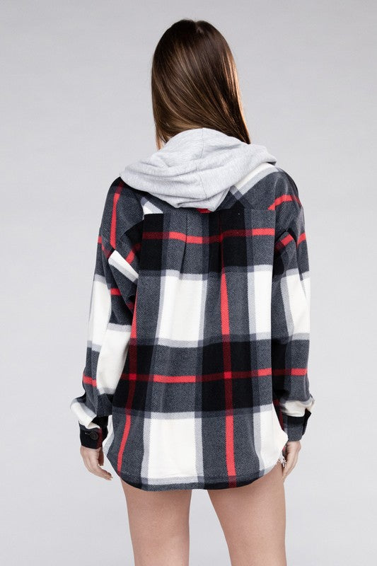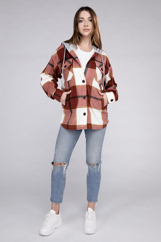 Stay cozy and stylish with our Plaid Drawstring Hooded Fleece Shacket. Crafted from soft fleece material, this shacket is the perfect blend of comfort and fashion. The plaid pattern features lines that align perfectly when the buttons are closed, adding a polished touch to the design. The drawstring hood adds extra warmth and versatility to this piece.