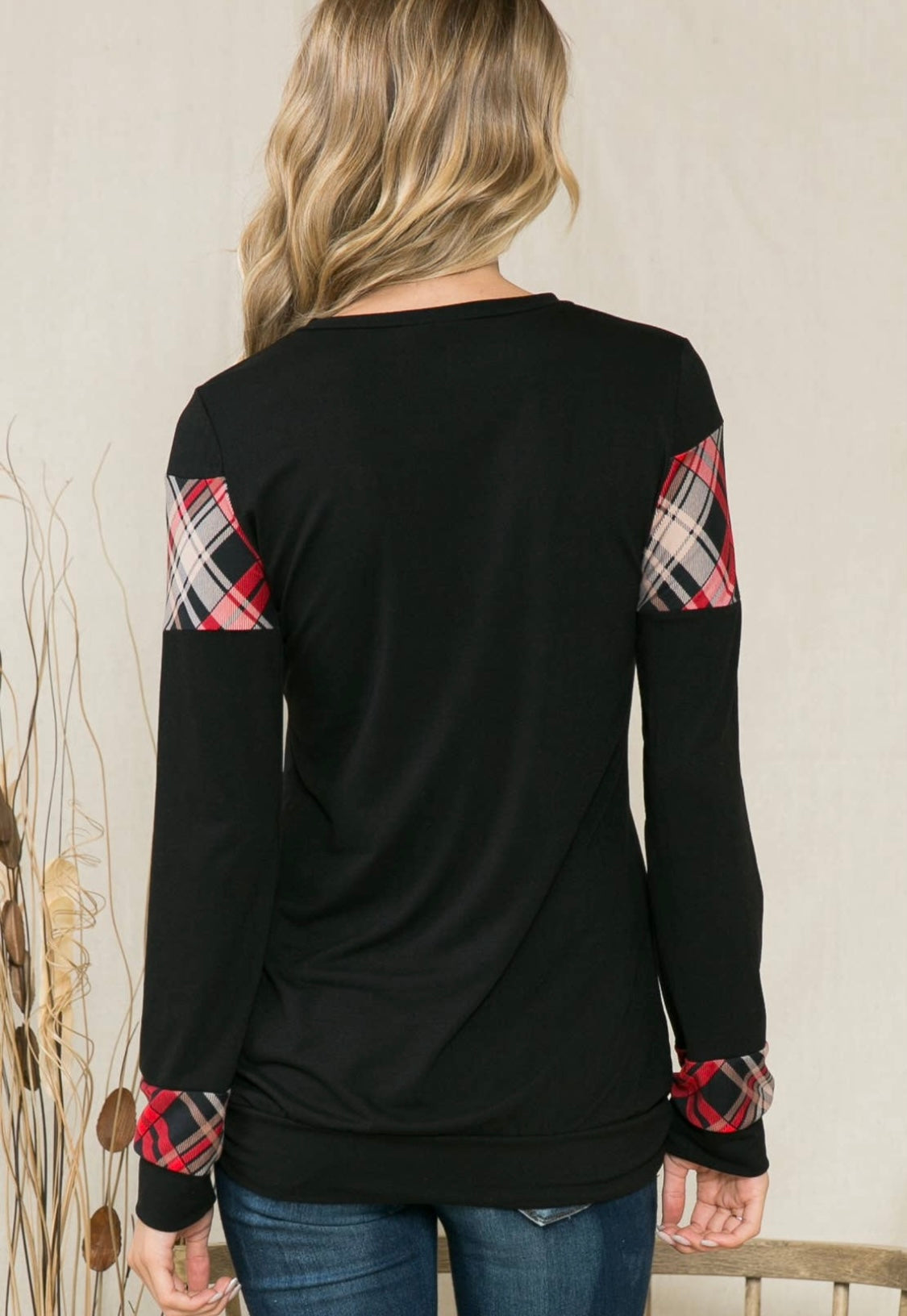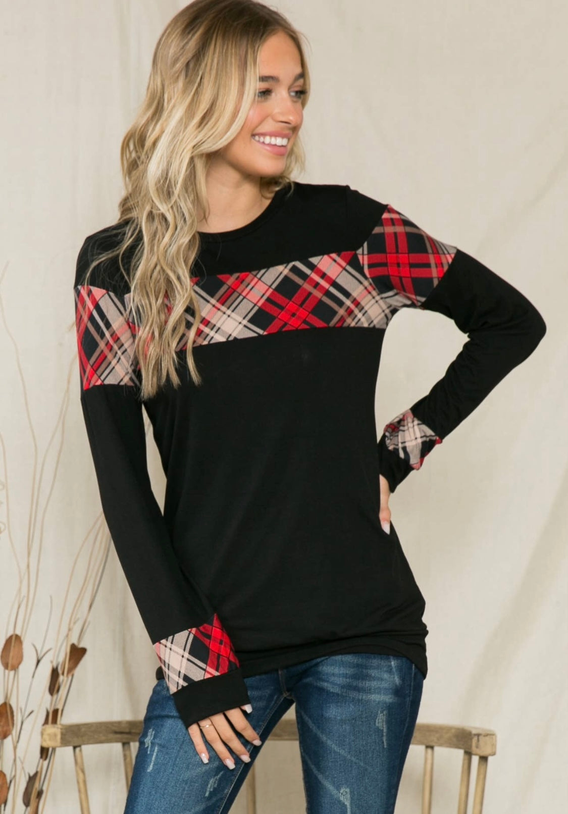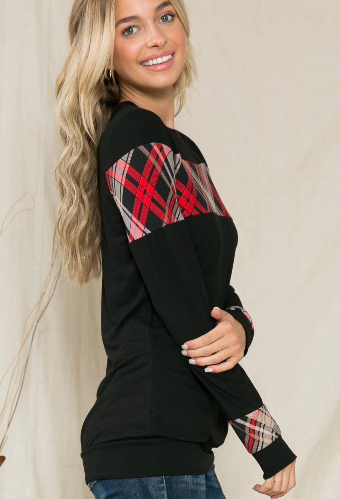 Cute plaid contrasting top that is perfect for the holidays! Comfy & lightweight. Layer up with it or pair with jeans & boots!