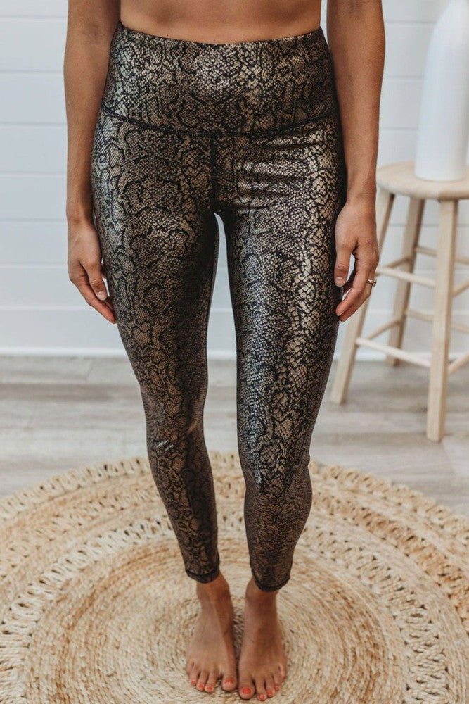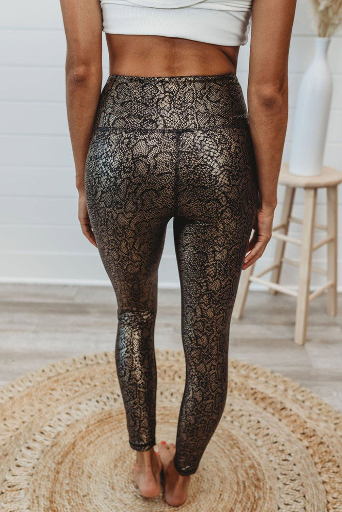 Add some prints to your athletic wear with the Anaconda Gold Foil Printed Full-Length Leggings. Beat the heat during intense workouts in figure-flattering high-waist leggings. Cut from moisture-wicking fabric that keeps you cool and comfortable. These leggings pair well with any of your solid tops.