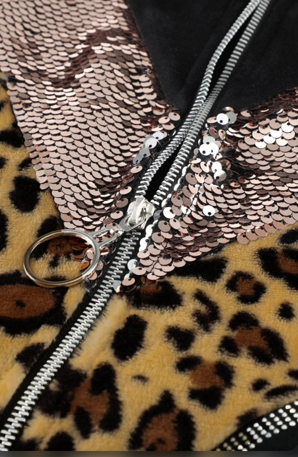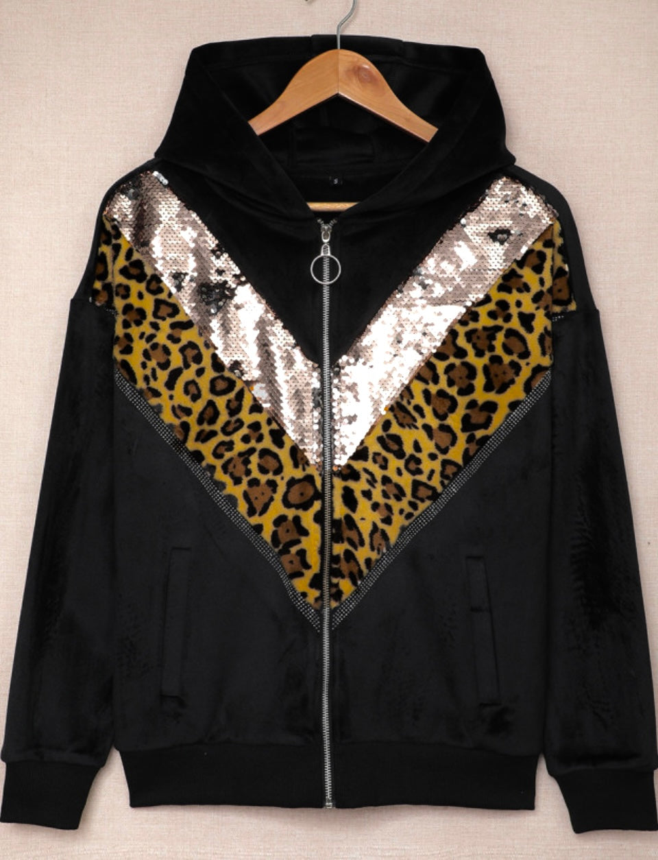You can't go wrong with this stunning zip up jacket. It is a stylish layering piece for fall/winter & it’s perfect for it. Express yourself with these sparkling sequins and a leopard pattern patchwork on the front. You will love wearing this look!