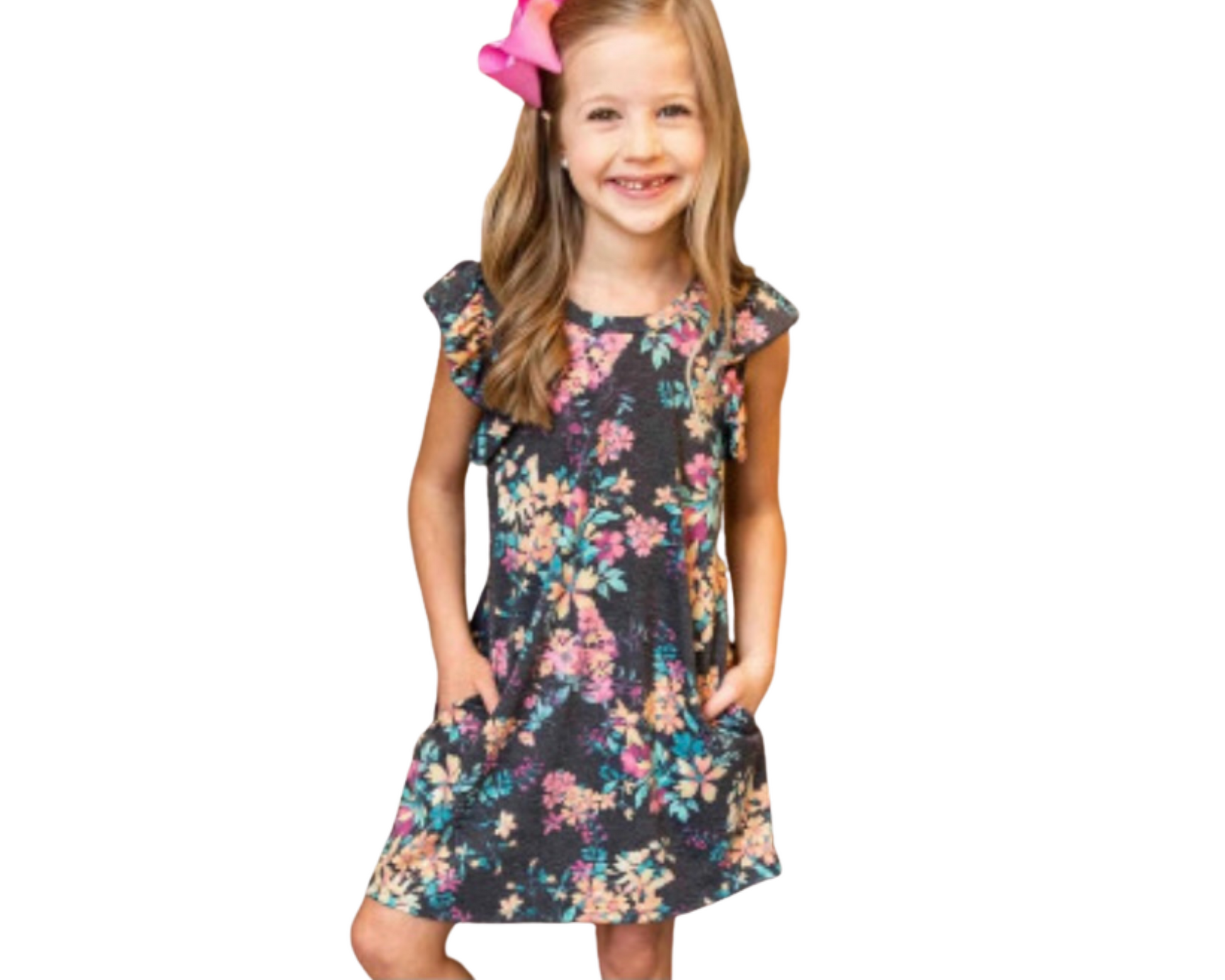 Gray Little Girls' Ruffle Sleeve Floral Dress with Pockets