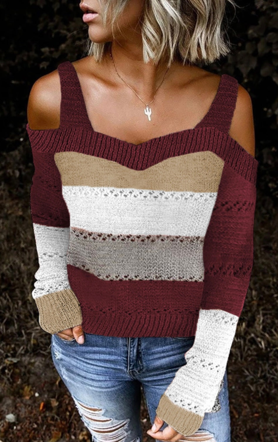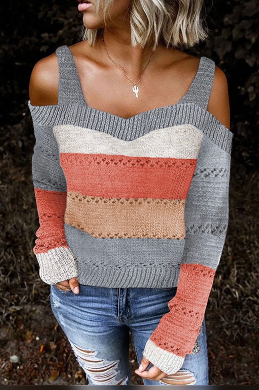 Multicolor Trim Colorblock Stripes Cold Shoulder Hollow-out Sweater