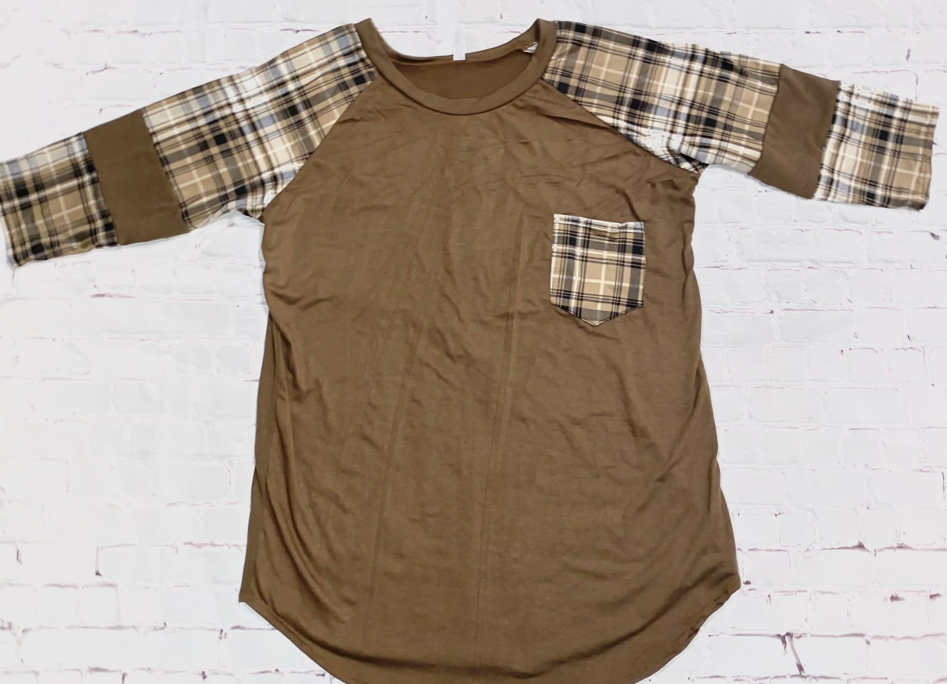 Darker Brown body with taupe plaid sleeves and pocket (like the flat lay picture)