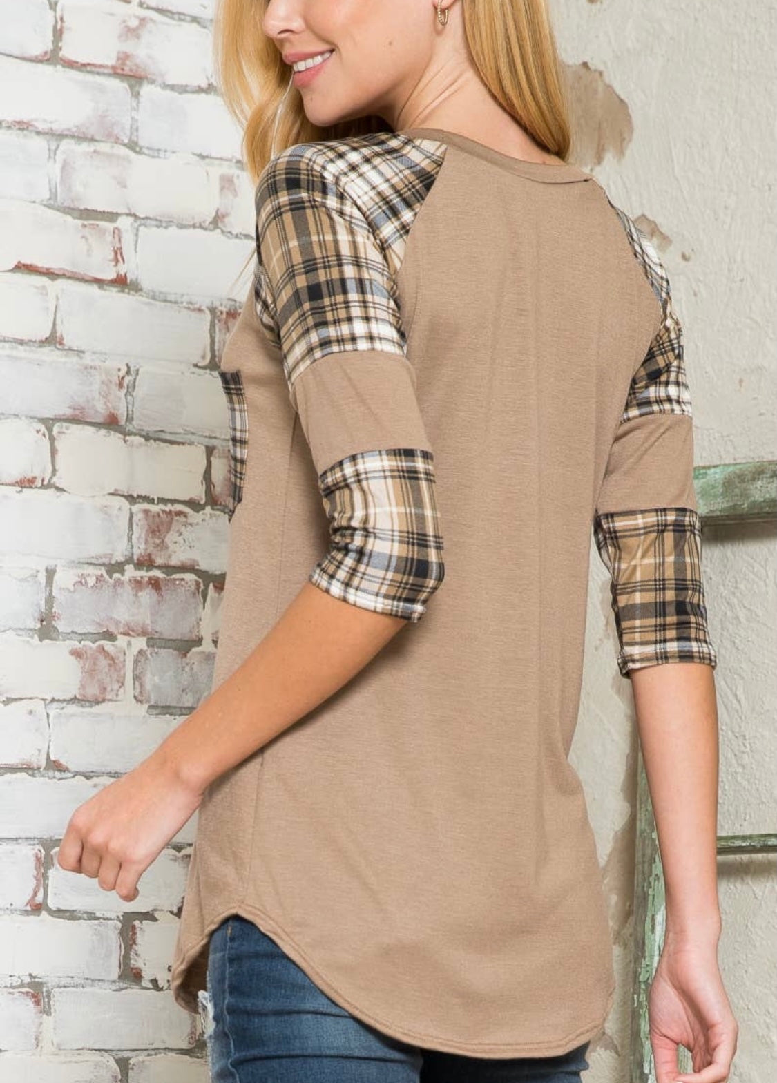 Acting Pro Brown Body Taupe Plaid Contrast Sleeve & Pocket Top