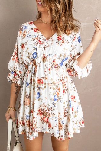 •Details: Ruffles, V-neck, Flounce hem shaped, High waisted, half length bishop sleeves, short dress